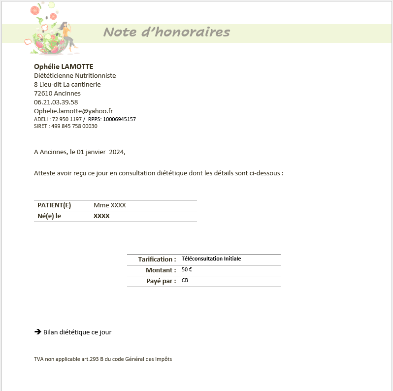 Remboursement des consultations par la mutuelle : Lorsque le patient effectue l'une des 4 consultations, il recevra une note d'honoraire établie en son nom, avec le n° ADELI et RPPS de la diététicienne, qu'il pourra remettre à sa complémentaire dans le cas éventuel, et selon son niveau d'adhésion à sa mutuelle, pour prétendre à un remboursement de l'acte diététique. Les Notes d'honoraire sont de 50€ pour la consultation initiale et 40€ pour les suivis diététiques. Mme LAMOTTE ne peut en aucun cas garantir le remboursement des mutuelles. Il appartient à chaque patient de contacter sa mutuelle pour vérifier les prestations et niveau de remboursement qu'il dispose.